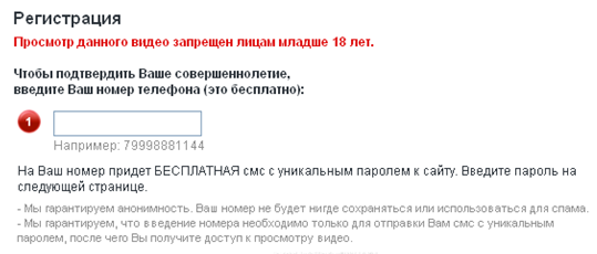 Владельцы некоторых ресурсов с порнографическим контентом придумали новый, сравнительно честный способ отъема денег у населения. При попытке пользователя загрузить какой-либо видеоролик, всплывает окно с предложением зарегистрироваться. Для этого необходимо указать номер телефона, на который придет «БЕСПЛАТНАЯ смс с уникальным паролем к сайту».